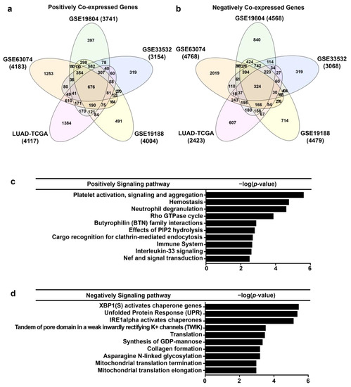 Figure 6. Positively and negatively correlated genes and signaling pathways in five public datasets. (a,b) Venn diagram of genes positively and negatively correlated with ATP/GTP binding protein 1 (AGTPBP1) was acquired using InteractiVenn. (c,d) List of top 10 signaling pathways from positively and negatively co-expressed genes obtained from the Reactome database. Statistical significance was determined using a p-value threshold < 0.01.