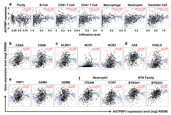 Figure 7. Correlation of ATP/GTP binding protein 1 (AGTPBP1) expression with diverse immune cells and related marker genes in lung adenocarcinoma (LUAD), analyzed using the Tumor Immune Estimation Resource (TIMER) web tool (n = 515). (a) Correlation between tumor purity and levels of diverse tumor-infiltrating immune cells related to AGTPBP1 expression. Correlation of AGTPBP1 expression with cytotoxicity marker genes induced by effector cells: (b) CD8+ T cell markers, including CD8A and CD8B; (c) gene markers of natural killer (NK) cell activation receptors, including killer cell lectin like receptor K1 (KLRK1), natural cytotoxicity triggering receptor 1 (NCR1), and natural cytotoxicity triggering receptor 3 (NCR3); (d) death signal marker genes, including Fas cell surface death receptor (FAS) and Fas ligand (FASLG); and (e) gene markers of cytolytic molecules, including perforin (PRF1), granzyme A (GZMA), and granzyme B (GZMB). (f) Positive correlation between AGTPBP1 expression and neutrophil and butyrophilin (BTN) family gene markers. Correlation constants and p-values are listed in Table 1, Table 2 and Table 3. ITGAM: integrin alpha M, CCR7: C-C chemokine receptor type 7.