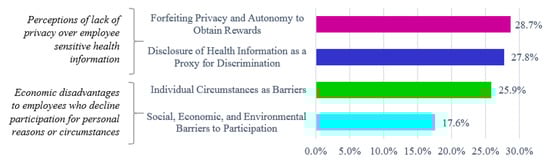 Concerns about employer discrimination based on genetic information are not new to the policy landscape; a controversial 2017 federal House Bill 1313 (HB 1313) sought to grant employers access to employees’ and employee beneficiaries’ genetic health information under the notion of “preserving employee wellness” [16,30,31]. Social justice critics responded by arguing that genetic information privacy is required to deter or prevent the rectification of historical acts of discrimination [32,33,34,35]. Some have also argued that genetic testing cloaked under the stewardship of employer-sponsored wellness programs can reveal to an employer genetic health risks that were not originally sought (secondary results) but bear clinical relevance or importance to employees [36]. There are also concerns that health-contingent (versus participatory) wellness programs are inherently discriminatory because they allow employers to treat employees differently based on health status and assess penalties if employees do not complete a health risk assessment, which would imply coercion in the sense that employees must disclose non-work-related yet sensitive health or genetic information to employers [37,38,39]. Our study confirms that previous concerns expressed by experts through blogs and peer-reviewed commentary actually exist among a broad range of stakeholders. Importantly, this study provides empirical evidence that there are concerns about how the disclosure of sensitive health information to employers and unregulated third parties might lead to information asymmetries, or an imbalance in power through an amassing of information, that might enable employers to engage in possible backdoor employee discrimination.