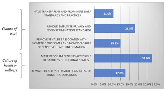 A grounded theory approach was also used to conduct inductive coding and a qualitative analysis of 75 comments from interview transcripts [23]. Our analysis revealed two key best practice themes (with 97.3% agreement between the two interview coders), which were promoting a (1) culture of trust and (2) culture of health or wellness in the workplace. We defined “culture of trust” as a “collective norm that embodies the conviction that another person or entity will perform certain actions, or behave as promised”, which we adapted from previous definitions in the social science literature [24,25]. Adapting also from the literature, we defined a “culture of health or wellness” as “an intentional, collective norm to ensure that diverse individuals and populations lead healthier lives now and for generations to come by making it easier and more rewarding for them to select lifestyles that foster health” [26,27,28].