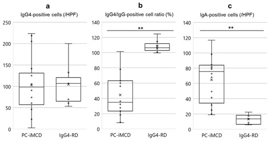 The number of IgA-positive cells was significantly higher in the PC-iMCD group than that in the IgG4-RD group (p < 0.001) (Figure 2 and Supplementary Figure S2).