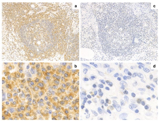Immunohistochemical analysis of IL-6 expression. IL-6 expression via immunohistochemistry in PC-iMCD ((a), 200× and (b), 400×) and IgG4-RD ((c), 200× and (d), 400×) groups is shown. (a,b) IL-6 was strongly expressed in most cells in the interfollicular and germinal center area (score 3). Positive cells showed granular cytoplasmic staining. (c,d) Certain cells in the interfollicular and germinal center area were “dim positive” for IL-6 (Score 1). IL-6, Interleukin-6; HPF, high-power field.