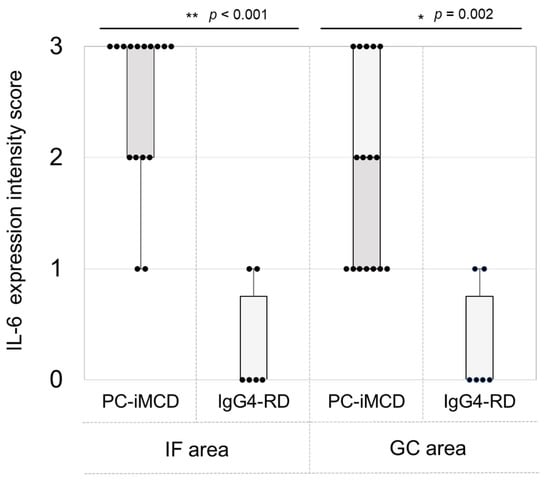 Comparison of IL-6 expression intensities. IL-6 immunostaining was available for 16 PC-iMCD and 6 IgG4-RD cases. The intensity of IL-6 staining in interfollicular (IF) and germinal center (GC) areas was assessed by two pathologists. Key: 0 = negative, 1 = dim positive, 2 = positive, 3 = strongly positive. IL-6 intensity scores in the IF and the GC areas were significantly higher in the PC-iMCD group than those in the IgG4-RD group (p < 0.001, p = 0.002, respectively). The graph depicts individual values and boxplots with whiskers representing minima to maxima. Differences between the two groups were evaluated by the Mann-Whitney U test (* p < 0.05, ** p < 0.001).