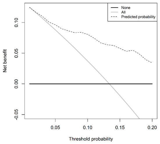 Multivariable logistic regression showed that a higher PSA-D and a higher age at time of biopsy were significantly (p ≤ 0.001) related to a higher risk of csPCa (I) diagnosis in PI-RADS 3 cases, while the largest index lesion diameter was not (p = 0.51) (Table 3). To avoid data-dependent variable selection for the regression model, the largest index lesion diameter is included in the model despite not being a significant predictor. The discrimination of this model is 0.80 (95% CI 0.73–0.87). The model has a higher net benefit compared to a biopsy-all PI-RADS 3 patient strategy at the threshold probability of ≥2% (Figure 2). Applying a risk-based threshold of 5% would result in 23% fewer TBx sessions and 13% fewer low-risk PCa diagnoses at the cost of missing 3% csPCa (I). Table 5 shows the numbers of avoided TBx sessions, low-risk PCa diagnoses, and missed csPCa (I) for the model using a risk threshold range of 2% to 10%. When accepting missing no more than 5% of the csPCa (I) diagnoses, a risk threshold of 7% would result in 34% fewer TBx sessions and 23% low-risk PCa diagnoses avoided. When not accepting missing the diagnosis of csPCa (I), a risk threshold of 3% should be applied, resulting in avoiding 10% of TBx sessions and almost no reduction in the diagnosis of low-risk PCa.