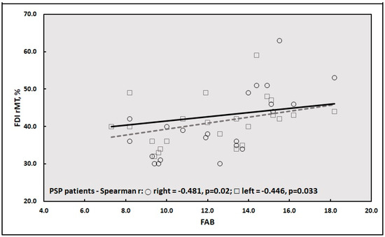 Finally, the correlation analysis between clinical-cognitive and TMS data in the three groups disclosed a significant positive correlation between FAB score and rMT from both hemispheres in PSP patients (Figure 1).