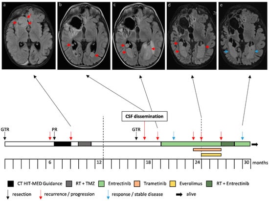 Molecular profiling has significantly improved diagnosis and prognostic prediction of pediatric brain tumors and has therefore already been implemented in the current as well as the upcoming WHO classification of tumors of the central nervous system (CNS) [1]. Gene fusions, including the neurotrophic tyrosine kinase (NTRK) family or c-ros oncogene 1 (ROS1), are relatively rare, yet their therapeutic impact has been proven in multiple solid tumor types [2,3,4]. NTRK gene fusions occur with a prevalence of less than 1% across all tumor types [5,6]. With respect to brain tumors, the estimated prevalence of NTRK-fusions is 0.55 to 2% for gliomas and neuroepithelial tumors [5]. In the subgroup of infant hemispheric glioma (IHG), nearly two-thirds of cases harbor molecular alterations of anaplastic lymphoma kinase (ALK), NTRK, ROS1 or tyrosine-protein kinase MET [7,8]. Adult and infant NTRK-fused gliomas are primarily located in the hemispheres with high-grade histology, whereas in older children, a more diverse anatomic distribution and low to high-grade histologic grades are found [9]. Adjuvant chemotherapy (CT) after surgery is the first approach in infants and allows delay or even avoidance of radiotherapy (RT) with a 5-year overall survival (OS) of 25.0% and 42.9% in ROS1- and NTRK-driven tumors, respectively [7,10,11]. In older pediatric patients, treatment consisting of surgery, RT and CT is applied, resulting in long-term survival rates around 10% [12]. Concomitant genomic alterations of NTRK-fused gliomas are more frequent in adult patients and high-grade tumors and include, among others, CDKN2A/B loss, TERT promoter mutation, TP53 mutation/biallelic inactivation/loss, PTEN loss/mutation/biallelic inactivation, EGFR amplification, ATRX mutation, RB1 loss, and PIK3CA mutation [9].