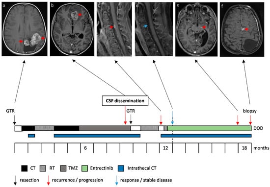 Case 2, a gliosarcoma harboring an EML4:NTRK3 fusion. Therapy response and progression of metastases under treatment with entrectinib is depicted in axial T1 weighted contrast-enhanced magnetic resonance images of the brain and sagittal images of the cervical spine. The red arrows indicate the primary tumor (a) and metastases (b,c,e,f), the blue arrow the regression of the perimedullary metastasis (d). The timeline indicates the different treatment strategies and interventions.