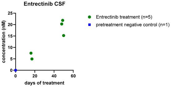 As already mentioned, penetrance of the brain is of essential importance in the treatment of CNS tumors, but so far, evidence for CSF penetration of entrectinib has been limited to preclinical studies [26]. Using our previously published approach [15], we analyzed entrectinib CSF penetration in 5 samples of case 2 obtained before administration of intrathecal therapy. We found entrectinib concentrations in the low nM range, which increased during ongoing therapy (Figure 3). As case 1 has no Ommaya reservoir and underwent no surgery at the MUV, CSF samples were not available of this patient for HPLC-MS analysis.