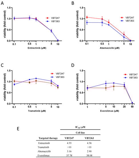 Effect of single-agent targeted therapies in EML4:NTRK3 positive cell lines. The impact on cell viability of (A) entrectinib, (B) abemaciclib, (C) trametinib and (D) everolimus on the primary tumor (VBT247) and the 3rd recurrence under treatment with entrectinib (VBT363) was tested after 72 h incubation by ATP assay in triplicates. (E). The inhibitory effect is expressed as IC50 values calculated from full dose–response curves (drug concentrations inducing a 50% reduction of the cell number in comparison to the untreated control cells).