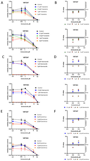 The impact of a combined application of the NTRK inhibitor entrectinib with other targeted therapies (e.g., abemaciclib, trametinib and everolimus) was tested for short- (72 h) and long-term exposure (14 days) by ATP and clonogenicity assays, respectively. NTRK inhibition distinctly synergized with trametinib in VBT247 and VBT363 cells (growth curves and combination indices shown in Figure 5A,B). In contrast, entrectinib generally antagonized the effect of abemaciclib in low concentrations but indeed synergized with abemaciclib in higher concentrations (5 µM abemaciclib) depicted in Figure 5C,D. Last, entrectinib showed additive to synergistic effects when combined with everolimus in VBT247 and VBT363 cells (Figure 5E,F).
