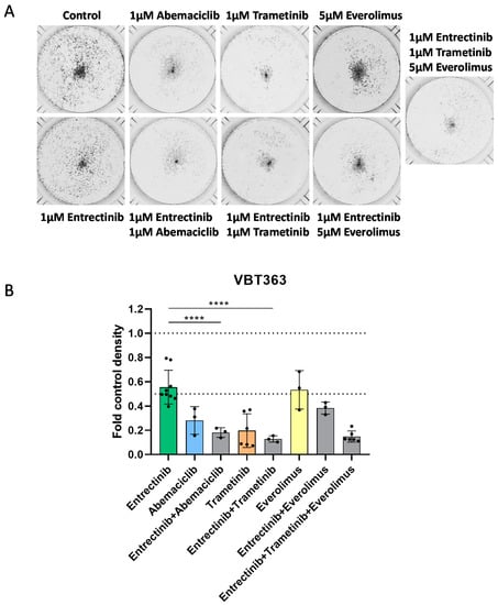 Effect of entrectinib and combination treatment on cell viability and toxicity. Effects of combined long-term application of entrectinib with trametinib, abemaciclib and/or everolimus in VBT363 cells were tested by clonogenicity assays in triplicates. (A) Cells were fixed and stained with crystal violet, and wells were photographed. (B) Densitometric quantification of photomicrographs shown in (A) using ImageJ2 software was assessed. Statistical significance of differences was analyzed by one-way ANOVA, ****, p < 0.0001.