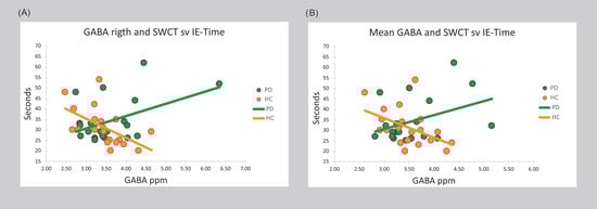 Bivariate scattergrams of the differential relationship in experimental groups between cerebellar gamma-aminobutyric acid (GABA) and cognitive interference. Legend: (A) right and (B) left and right mean values of GABA cerebellar concentration and response inhibition performance in patients diagnosed with Parkinson Disease (PD) and Healthy Comparators (HC), as measured through the time (in seconds) Interference Effect of the Stroop Word-Color Test short version (SWCT sv IE-Time). ppm: parts per million.