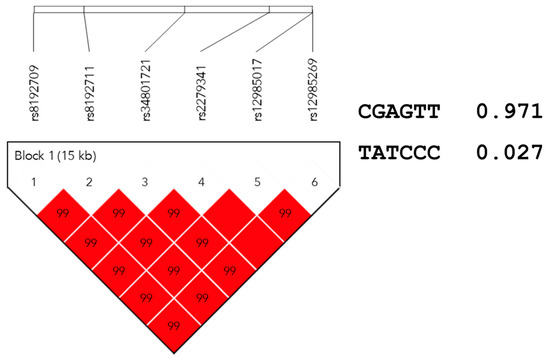 Categorical variables such as gender and variant occurrences are presented in percentages and frequencies. Continuous variables such as age are presented with average and standard variations. The chi-squared test with one degree of freedom was used to test the departure from HWE for each variant. Data were analyzed with PLINK 1.9 or 2.0 [44] and R (version 3.6.3). Linkage disequilibrium analysis among pairs of SNVs was performed to identify the haplotype. Estimation of haplotype blocks and their frequencies were performed with PLINK and Haploview [45].