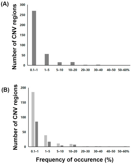 Distribution of copy number variation frequencies for the copy number variation regions in a Korean population. (A) Frequencies of copy number variation regions. (B) Copy number variation frequencies of the detected copy number variation regions, divided into gains and losses.
