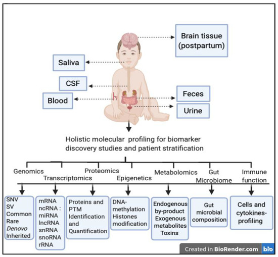 Schematic showing possible body fluids and tissues that may be essential for biomarker discovery in ASD patients. Blood is the most common site for biomarker discovery. However, saliva, urine, and feces are easily accessible and have been used recently for biomarker discovery studies. Although CSF and brain tissues could also be used for biomarker discovery in ASD, their accessibility is very difficult or even impossible (in the case of the brain, unless it is postpartum) for such purposes. Collecting huge biological data from a range of body fluids may help in performing holistic molecular profiling in the area of genomics, transcriptomics, proteomics, epigenetics, metabolomics, gut microbiome, and immune system, which may enhance biomarker discovery and patient stratification.