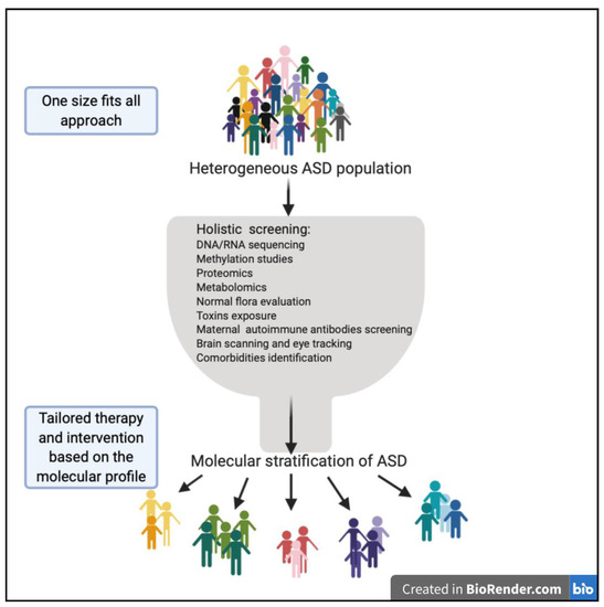 The extreme heterogeneity and complexity of ASD in terms of clinical manifestations, genetic background, and biological changes makes it hard for ASD to fit into a one size fits all treatment and diagnostic approach model; thus, applying a multi-modal approach utilizing modern technologies is a key for proper stratification and achieving tailored therapy that is most fitted to an individual’s condition.