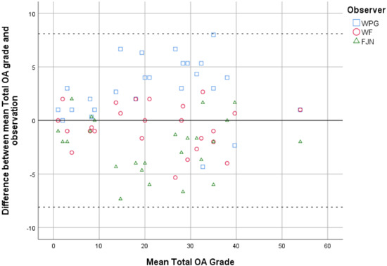 Intra-observer reliability for total OA grade was excellent, with an ICC of 0.97 (95% CI, 0.93 to 0.99). The Bland–Altman plot showed an even spread of errors between the first and second observation, with a mean error of −3.5 (SD, 3.4). Inter-observer reliability for total OA grade was also excellent, with an ICC of 0.94 (95% CI, 0.86 to 0.98). ICCs for inter-observer reliability were comparable between observer pairs of different proficiency levels, 0.95 between WPG and WF, 0.93 between WPG and FJN, and 0.97 between WF and FJN. The Jones plot showed an even spread of errors between all observers, with WF giving grades around the mean, FJN giving lower grades on average, and WPG giving higher grades on average (Figure 3).