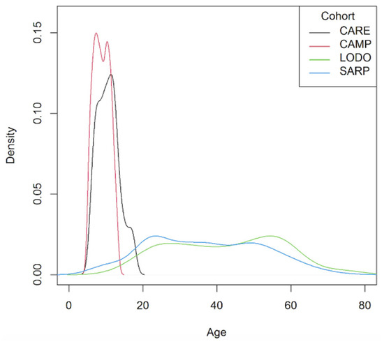 Distribution of ages for subjects from CARE, CAMP, LODO, and SARP.