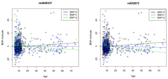 The plots below show the effect of the six SNPs on the association between age and BDR regressing age, sex, obese, overweight, cohort and genetic ancestry. Note that the minor allele frequency for rs1439427, rs10476900, rs72646209 is less than 0.05.
