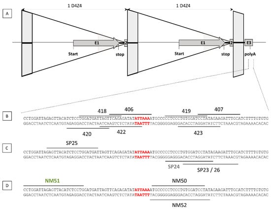During the past 10 years, several strategies aiming at inhibiting DUX4 expression have been developed (for review see []) and the poly(A) signal was already successfully targeted to inhibit DUX4 expression [,]. Targeting the key elements of DUX4 mRNA’s 3′UTR is attractive for several reasons: (i) correct polyadenylation of mRNAs is required for their stability, nuclear export and efficient translation, and targeting the polyadenylation signal can result in decreased gene expression (for review see []). (ii) DUX4 expression is common in FSHD1 and FSHD2 patients and therefore targeting DUX4 will be beneficial to all FSHD patients. (iii) Contraction of the D4Z4 array on chromosome 10, which carries a single point mutation in the polyadenylation signal sequence found on chromosome 4, does not lead to DUX4 expression []. (iv) DUX4 expression has been described in keratinocytes [] and in EBV-immortalized FSHD lymphoblastoid cell lines []. Moreover, DUX4 expression [,] is normally suppressed in post-mitotic tissues with the exception of testis where alternative 3′exons are used with a polyadenylation signal in exon 7 that is approximately 6.5 kb further telomeric to the one used in muscles []. Moreover, DUX4 might act as a transcription factor to activate cleavage-stage-specific gene expression and may be activated in the primary spermatocytes during spermatogonia and it may therefore be important to target DUX4 in muscles preferentially. Targeting the polyadenylation signal located in exon 3 may lead to the inactivation of the pathogenic DUX4 only, the one that is expressed in the skeletal muscle, whereas the DUX4 mRNA expressed in testis may be spared.