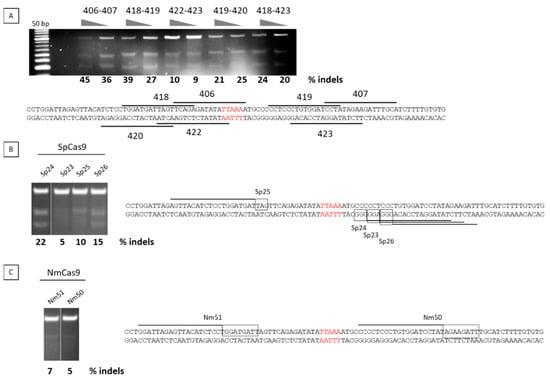 Nuclease selection. U2OS cells were transfected with expression plasmids for TALENs (A) or for guide RNAs and cognate Streptococcus pyogenes Cas9 (SPCas9 in B) or Neisseria meningitides Cas9 (NmCas9 in C) proteins. Two days after transfection, DNA was extracted and the frequency of indels in the targeted DUX4 PAS was analysed by the T7E1 assay. The target region was amplified by PCR, then PCR products were denatured, followed by re-annealing, leading to a population of double strand fragments, some of which containing mismatches that are detected and cleaved by the T7 endonuclease. The cleavage products are visible on an agarose gel. PCR product is 500 bp long and after T7E1 digestion, expected bands are roughly 200 and 300 bp long depending on the position of mutations induced by the nuclease tested. The proportion of indels was estimated from quantification of the different bands corresponding to non-cleaved and cleaved PCR products.
