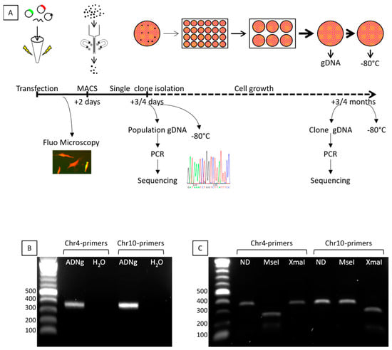 Flow chart and primers validation. The flow chart is described (A). Genomic modifications are assessed by sequencing, Primers were designed to specifically recognize chromosomes 4 or 10. The PCR products are similar in length (B) but digestion by MseI (present only on chromosome 4) or XmaI (present only on chromosome 10) confirmed the PCR specificity (C).