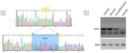 We decided to not incorporate a resistance gene in our constructs in order to be as close as possible to the context of a clinical application. After transfection, we detected two clones with genetic modifications. This might be due the absence of selection and also to the difficulty to transfect myoblasts. In order to increase our chance to inhibit DUX4 expression, we co-transfected a double strand oligonucleotide carrying the miR1 target sequence: in the case of the use of an alternative polyadenylation (APA) signal located downstream of the regular one, DUX4 translation would have been strongly impaired by its presence in the DUX4 mRNA. Indeed, miR1 is a well described myomir, which promotes myoblast-to-myotube differentiation and is up-regulated during this process [].
