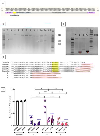 The second clone presented a complex genotype with a recombination between the ssDNA oligonucleotides miR-random and miR-upstream and the genomic DNA (Figure 5A).
