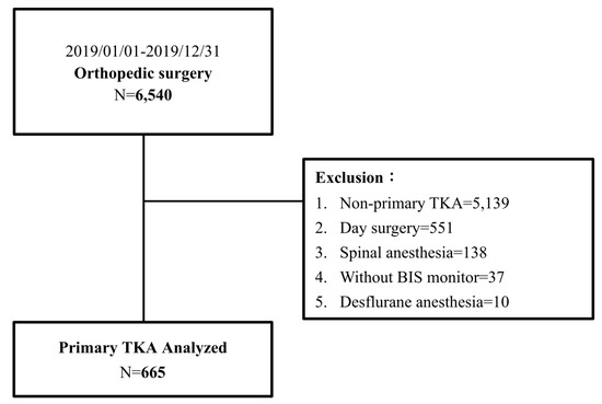 This study was approved by the Institutional Review Board (IRB) of Kaohsiung Chang Gung Memorial Hospital (IRB number: 202100276B0). The requirement for informed consent from patients was waived because their data were de-identified. All methods were performed in accordance with the Declaration of Helsinki and HIPAA Privacy Rule. A total of 6540 orthopedic surgeries were performed between January and December 2019 at our hospital. Data from medical records and anesthesia records were retrieved from the hospital’s electronic database, and data during the stay in the post-anesthesia recovery unit (PACU) and those from routine postoperative daily visits were collected. Patients were visited by well-trained nurse anesthetists within 24 h after surgery. These patients were subjected to the exclusion criteria, which included non-primary TKA, desflurane anesthesia, spinal anesthesia, anesthesia without bispectral index monitoring, and day surgery. Thirteen patients had thirteen missing records of sevoflurane consumption and six missing records of Apfel score, and these missing values were reconstituted with multivariate imputation [30] by R with mice [31] package. Finally, 665 patients were included in the analysis (Figure 1).