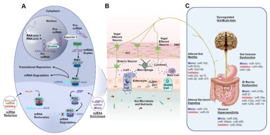 miRNA mediated pathophysiological mechanisms and potential therapeutic alternatives for DGBIs. (A). miRNA biogenesis and miRNA therapeutic approaches to reduce or enhance miRNA levels leading to mRNA restoration or mRNA degradation/translational repression, respectively, (B). Dysregulated miRNAs are evidenced in gastrointestinal pacemaking cells, immune cells, intestinal epithelial cells, and enteric neurons, (C). Possible miRNA therapeutics based on pathophysiological mechanisms. Abbreviations: AGO, argonaute; CLDN1, claudin-1; EC cell, enterochromaffin cell; ICC, interstitial cell of Cajal; miRNA, microRNA, mRNA, messenger RNA; RISC, RNA-induced silencing complex; SMC, smooth muscle cell; ZO-1, zonula occludens; 5-HT, 5-hydroxytryptamine.
