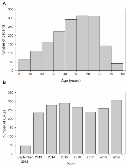 A total of 1921 ffERGs from 1655 patients (730 men and 925 women) were included in this retrospective study. The mean age of the patients was 47.4 years (range, 0.4–90.3 years) when the first ffERG was recorded. The age distribution of the patients is shown in Figure 1A. ffERGs were performed most frequently in patients aged between 50 and 60 years (18.9%, 313/1655), and 55.3% (916/1655) of ffERGs were performed in patients aged between 40 and 70 years. From September 2012 to November 2019, the average number of ffERGs performed was 262 times per year, and the number of annual ffERGs was constant during the study period (Figure 1B).