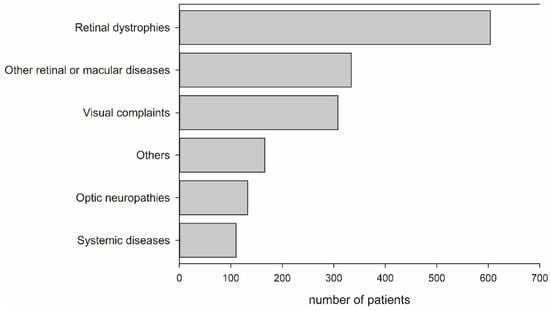 The cumulative number of patients in the six diagnosis groups are shown in Figure 2. Among the six groups, retinal dystrophies were the most prevalent diagnoses, accounting for 36.5% of patients (604/1655). The detailed diagnoses associated with these six groups and their age distributions when they received ffERG are listed in Table 1.