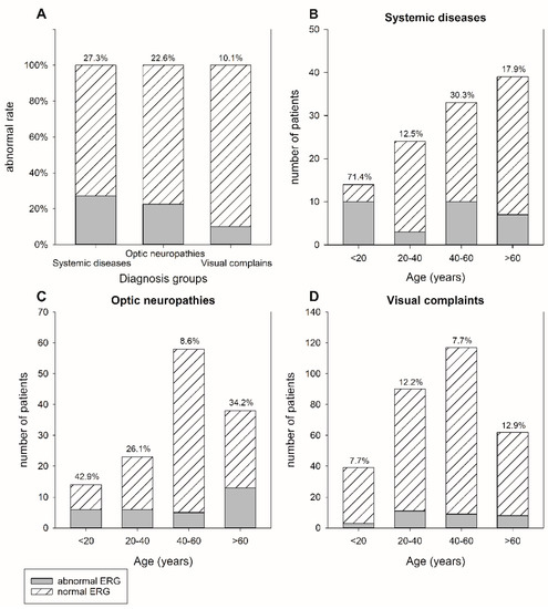 The use of ffERG in the clinical diagnosis of retinal dystrophies and other maculopathies and retinopathies is well established. Hence, we further investigated the rates of abnormal ffERGs in the ‘systemic diseases’, ‘optic neuropathies’, and ‘visual complaints’ groups in order to reveal the role of ffERG. We found that 27.3% (30/110), 22.6% (30/133), and 10.1% (31/308) of patients presented with abnormal ffERGs in these three groups, respectively (p < 0.001 by the Chi-squared test, Figure 3A). The distribution of abnormal rates after stratification by age in different groups is shown in Figure 3B–D. Of the patients younger than 20 years, 71.4% (10/14) exhibited abnormal ffERGs in the ‘systemic disease’ group. Among them, five patients were confirmed to have developmental delay with underlying epilepsy or cerebral palsy. Syndromic diseases were highly suspected in the other five patients. In the ‘optic neuropathies’ group, most abnormal ffERGs were found in patients older than 60 years (34.2%, 13/38). Among them, eight patients (61.5%, 8/13) had glaucoma, three had optic nerve atrophy (23.1%, 3/13), and the other two patients had ischemic optic neuropathy and compressive optic neuropathy, respectively. In contrast, the subgroup of patients under 20 years of age exhibited the highest abnormal rate (42.9%, 6/14). The diagnoses were optic nerve atrophy in five patients and optic neuritis in one patient.