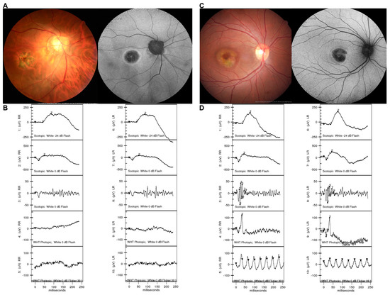 In the ‘retinal dystrophies’ group and the ‘other retinal or macular diseases’ group, most of the patients had provisional diagnoses after acquiring image examinations including fundus photography, fluorescein angiography, and OCT. ffERGs are essential for evaluating the extent of retinal dysfunction by quantifying the amplitude and implicit time. Characteristic ffERG patterns along with the imaging examinations confirmed the diagnoses (Figure 4). Moreover, ffERGs were helpful in subsequent visits as a reference for tracking disease progression as well [22,23]. In contrast, provisional diagnoses are more difficult to establish when the patients are too young to cooperate with physicians, or when in the early stage of disease with minimal changes in anatomical structure, which are virtually undetectable in ordinary studies [3,17]. ffERG plays an important role in collecting information and enhancing the diagnosis in these situations. For example, ffERG in severely visually impaired children is able to demonstrate typical abnormalities that support the diagnosis of Leber’s congenital amaurosis, which accounts for a large portion of blindness during the first decade of life. Therefore, the timing of clinical diagnosis facilitates molecular diagnosis and early rehabilitation, and might possibly permit genetic therapy to rescue visual function [3,24]. In some cases of retinal or macular diseases, ffERGs were used to confirm the baseline retinal function and to rule out the possible differential diagnoses. Subnormal or abnormal ffERGs may indicate a poor visual prognosis [20,25]. Moreover, multifocal ERG could further assist in the evaluation for maculopathy; for example, in patients with long-term use of specific medications, such as hydroxychloroquine, multifocal ERG is the standard tool for diagnosing and monitoring drug-associated retinal toxicity.