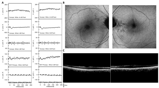 - Zahid, S.; Jayasundera, T.; Rhoades, W.; Branham, K.; Khan, N.; Niziol, L.M.; Musch, D.C.; Heckenlively, J.R. Clinical Phenotypes and Prognostic Full-Field Electroretinographic Findings in Stargardt Disease. Am. J. Ophthalmol. 2013, 155, 465–473. [Google Scholar] [CrossRef]