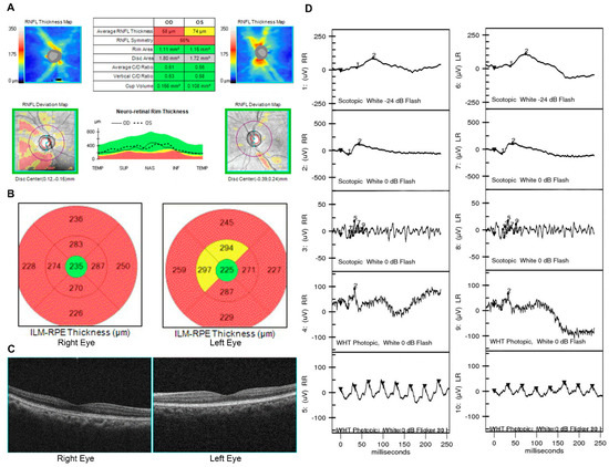 Multimodal images of a 67-year-old female patient diagnosed with advanced glaucoma and optic nerve atrophy. (A) OCT revealed enlarged optic cupping and a severely decreased retinal nerve fiber layer (58 μm in right eye and 74 μm in left eye), corresponding to the diagnosis of glaucoma and optic atrophy. (B,C) Moreover, a decrease in central macular thickness was also found in OCT, which raised the speculation of retrograde degeneration. (D) ffERG revealed an abnormal response in all three components, which further supported the proposal of retrograde degeneration.