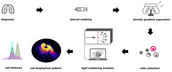 Schematic representation of the experimental approach. After a diagnosis of pulmonary malignancy, surgeon performs a pleural washing. The collected sample is processed with a density gradient separation process. Light scattering analysis is performed on single cell. Results of such analysis are used to find cells biophysical pattern and, later on, as basis for Machine Learning on unknown samples.