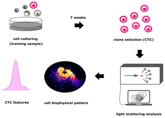 To collect potential CTC, we performed a density gradient separation on each sample. Since, we had an average of 40 to 60 mL of sample, within 3 h from the collection, each sample was layered on separation medium with density 1.077 (Ficoll) of an equal volume (ratio 1:1). Samples were centrifuged at 300 for 45 min, no brake. After the rotor of the centrifuged stopped, we collected the cells at the interface between sample fluid (at the bottom) and the Ficoll (at the top) with a Pasteur plastic sterile pipette. Depending on the state of the collected volume of cells, we evaluated to perform a washing with RBC lysis buffer (155 mM NH4Cl, 10 mM KHCO3, 0.1 mM EDTA) to eliminate possible RBC contaminants. Whenever the collected pellet of cells was visibly red, we added 10 mL of lysis for 5 min. Afterwards, samples were centrifuged at 200 for 10 min and re-suspended in a complete medium for circulant cells with the following composition: RPMI 1640, 10% FBS, 1% pen-strep, 1% L-Glutamine. For the whole time span needed for light scattering analysis—never longer than 2 h—cells were stored in the same complete medium and placed in a controlled ambience (37 °C, 5% CO2). Cells collected from NSCLC patients were cultured over time to select CTC in order to obtain a stable clone, which we labelled “training sample”. Such cultured cells provide the basis for subsequent CTC identification in other cell samples. Cells were cultured under controlled conditions (37 °C, 5% CO2) for seven weeks. This period of cell culture was necessary to obtain, in this pilot study, a stable clone from the isolated circulating cell, which allowed us to isolate the biophysical pattern of the labeled “training sample”. At three specific time steps, an aliquot of cells was collected to perform morphological single-cell analysis: time 0 (collection of NSCLC patient cells), time 1 (2 weeks of culturing), and time 2 (7 weeks of culturing). At each time step, cells were collected, centrifuged at 220 for 10 min and resuspended in complete RPMI medium.