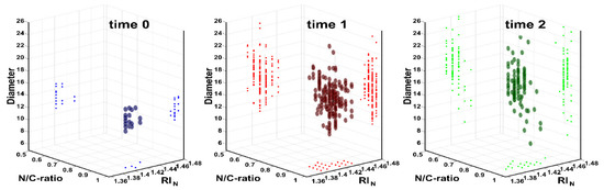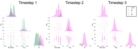 A colour legend permits us to distinguish the cell classes identified by the ML algorithm. The outcome of time 0 clearly indicates the coexistence of more than one cell type in the NSCLC sample. Four different classes of cells are in fact present: T-lymphocytes, B-lymphocytes, monocytes and CTC. From the histogram plots, we can notice how the N/C-ratio and RIN values of all cells overlap, where CTC can be distinguished because of their significantly higher D values. Values of the N/C-ratio span from 0.92 to 0.98. For time step 1, it is possible to notice that CTC (purple circles) become the predominant cell type. It is also clear how monocytes that were evident at time 0 diminish. A new cell type appears in the obtained results, which can be identified as granulocytes.