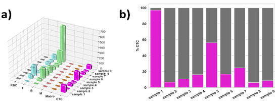NSCLC sample outcome. (a) Dimensional view of each cell classified with the trained ML algorithm (x-axis) in each experiment (y-axis). Z-axis indicates the number of identified cells. Please note that counting of cells refers to an average value of 50 mL of pleural washing, as described in Section 2.2. Each coloured line on x-axis represents a cell type, where y-axis indicates each experiment performed. Height of each bar indicates the number of cell type identified by the ML algorithm. CTC are fully coloured for clarity, where other cell types are transparent. (“RBC” = Red Blood Cells, “T” = T-lymphocytes, “B” = B-lymphocytes, “M” = Monocytes, “Macro” = Granulocytes, “CTC” = Circulating Tumour Cells). (b) Bar plot highlights the number of CTC in each NSCLC experiment.