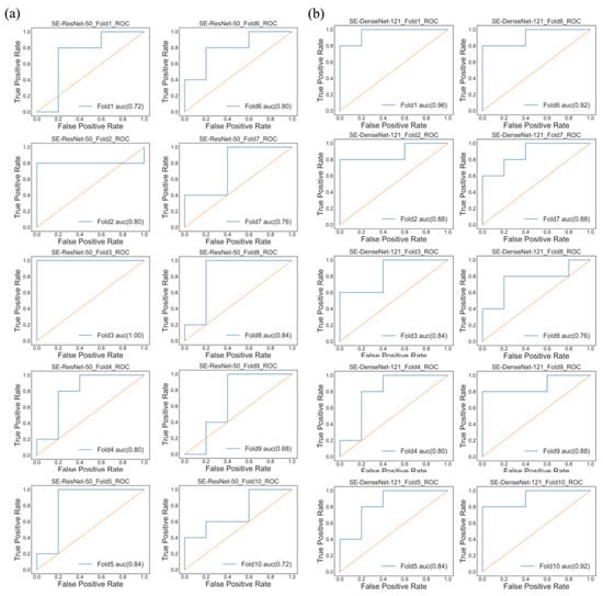 ROC curve showing the performance of each model. (a) The performance of the SE-ResNet-50 model had AUCs of 0.72, 0.8, 1.00, 0.8, 0.84, 0.8, 0.76, 0.84, 0.68 and 0.72. (b) The performance of the SE-DenseNet-121 model had AUCs of 0.96, 0.88, 0.84, 0.8, 0.84, 0.92, 0.88, 0.76, 0.88 and 0.92.