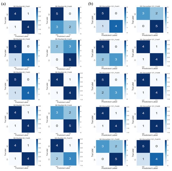 Confusion matrices of (a) ten SE-ResNet-50 models and (b) ten SE-DenseNet-121 models.
