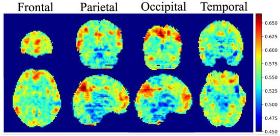 Average integrated gradients maps with a threshold of 0.45. The critical regions that are highlighted are the frontal lobe, parietal lobe, temporal lobe and occipital lobe.