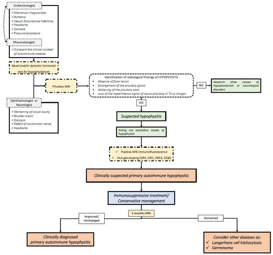 - Chiloiro, S.; Angelini, F. An Overview of Diagnosis of Primary Autoimmune Hypophysitis in a Prospective Single-Center Experience. Neuroendocrinology 2017, 104, 280–290. [Google Scholar] [CrossRef] [PubMed]