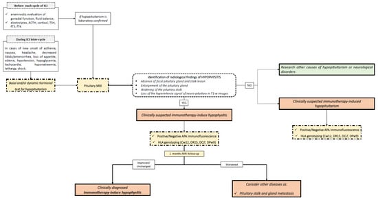 - Kobayashi, T.; Iwama, S.; Sugiyama, D.; Yasuda, Y.; Okuji, T.; Ito, M.; Ito, S.; Sugiyama, M.; Onoue, T.; Takagi, H.; et al. Anti-Pituitary Antibodies and Susceptible Human Leukocyte Antigen Alleles as Predictive Biomarkers for Pituitary Dysfunction Induced by Immune Checkpoint Inhibitors. J. Immunother. Cancer 2021, 9, e002493. [Google Scholar] [CrossRef]