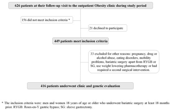 - Velázquez-Fernández, D.; Mercado-Celis, G.; Flores-Morales, J.; Clavellina-Gaytán, D.; Vidrio, R.; Vidrio, E.; Mosti, M.; Sánchez-Aguilar, H.; Rodriguez, D.; León, P.; et al. Analysis of Gene Candidate SNP and Ancestral Origin Associated to Obesity and Postoperative Weight Loss in a Cohort of Obese Patients Undergoing RYGB. Obes. Surg. 2016, 27, 1481–1492. [Google Scholar] [CrossRef] [PubMed]