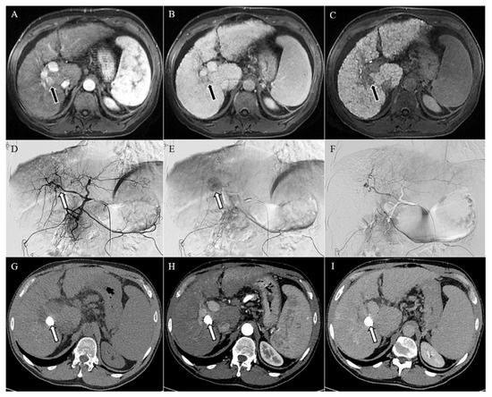 Magnetic resonance imaging (A–C) showing a lesion of 18 mm in the liver segment 8, hypervascularized in the arterial phase (arrow in (A)), with washout of the contrast media in the venous phase (arrow in (B)), and hypointense in the hepatobiliary phase (arrow in (C)), consistent with hepatocellular carcinoma in the context of cirrhosis. Angiographic study (D–F) of the liver confirmed the hypervascular lesion in the early and late arterial phases (arrows in (D,E), respectively), which was no longer visible after chemoembolization (F). Computed tomography (G–I) performed one month after chemoembolization demonstrated an homogeneous accumulation of the lipiodol in the unenhanced image (arrow in (G)), with no signs of relapse in the arterial and delayed phases (H,I).