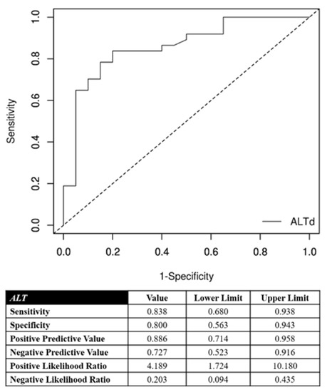 Correlation between alanine aminotransferase (ALT) increase and the objective response for target nodules. In the lower portion of the figure, the performance measures are reported using the optimal cutoff point (52%).