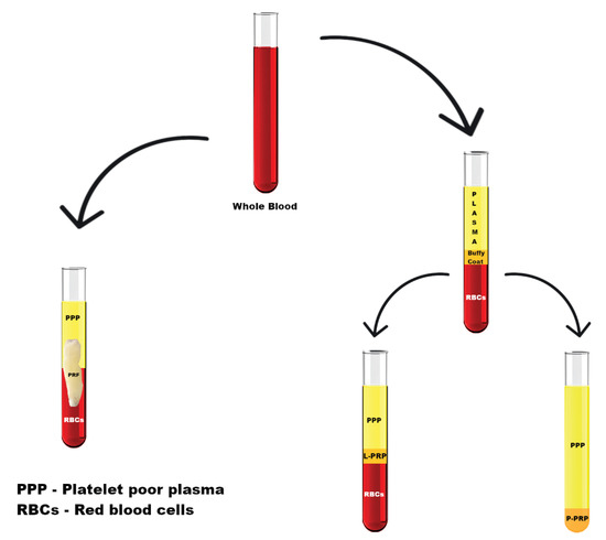 The differences in the methods of obtaining PRF, L-PRP and P-PRP are presented in Figure 1.