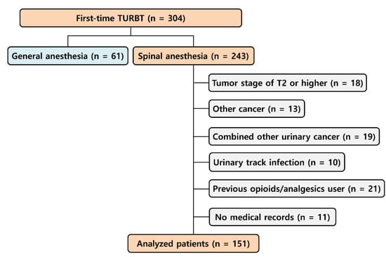 - Choi, W.J.; Baek, S.; Joo, E.Y.; Yoon, S.H.; Kim, E.; Hong, B.; Hwang, J.H.; Kim, Y.K. Comparison of the effect of spinal anesthesia and general anesthesia on 5-year tumor recurrence rates after transurethral resection of bladder tumors. Oncotarget 2017, 8, 87667–87674. [Google Scholar] [CrossRef]